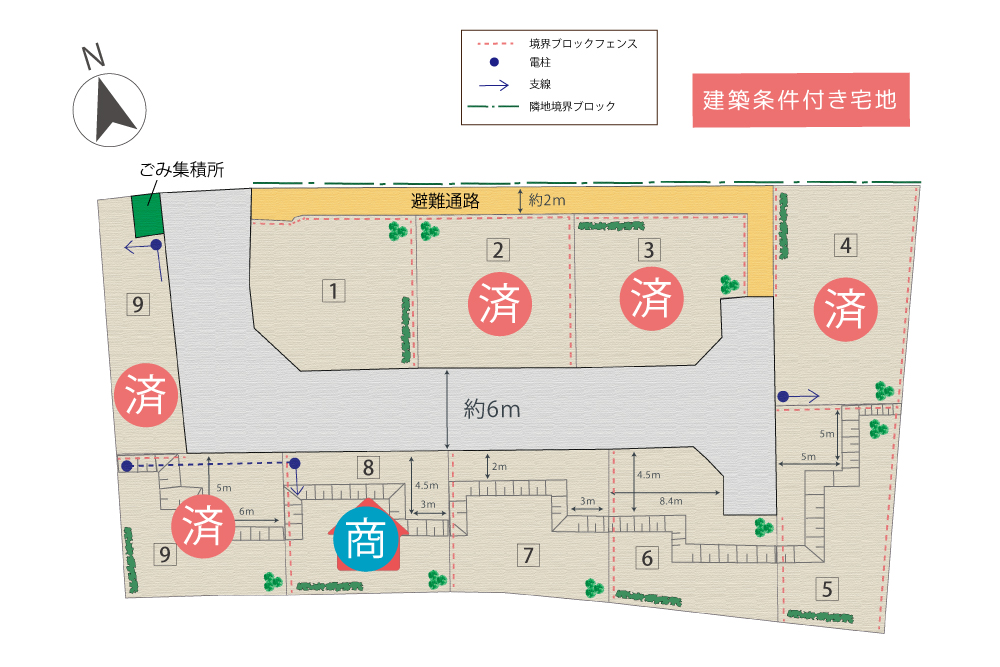 | その他特記事項 | ■土地契約締結後3ヶ月以内に建築請負契約が不成立の場合は、土地売買契約は白紙となり、受領済の手付金等の代金は全額無利息にて返金致します。 ■弊社売主の分譲地にて、西和不動産の建築条件付きでご購入頂いた場合は、地盤補強工事(杭工事等)は、西和不動産の負担にて施工致します。また弊社では第三者による地盤保証20年をつけており、保証会社による解析を基に補強工事を行っております。 (弊社指定の補強工事以上の工事を求められる場合は、別途費用を要します)■水道加入金129,400円別途要(20φの場合)■境界ブロック代1号地36.6万円/5号地52.6万円/6号地17.6万円/7号地16.2万円/8号地16.2万円 |