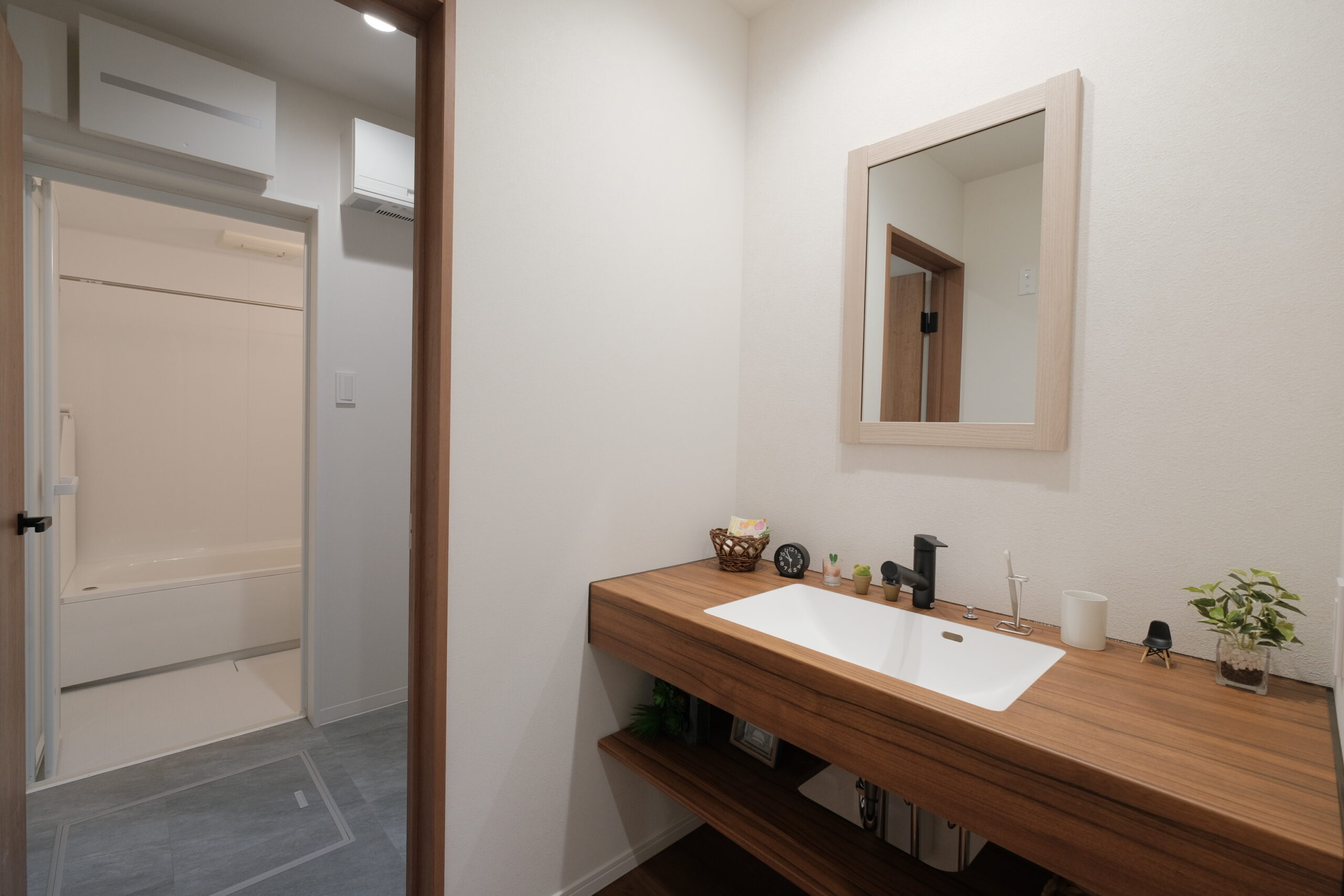 洗面室と脱衣室が別れていることで、脱衣室使用中でも 洗面台を使用でき、生活渋滞を防げます。