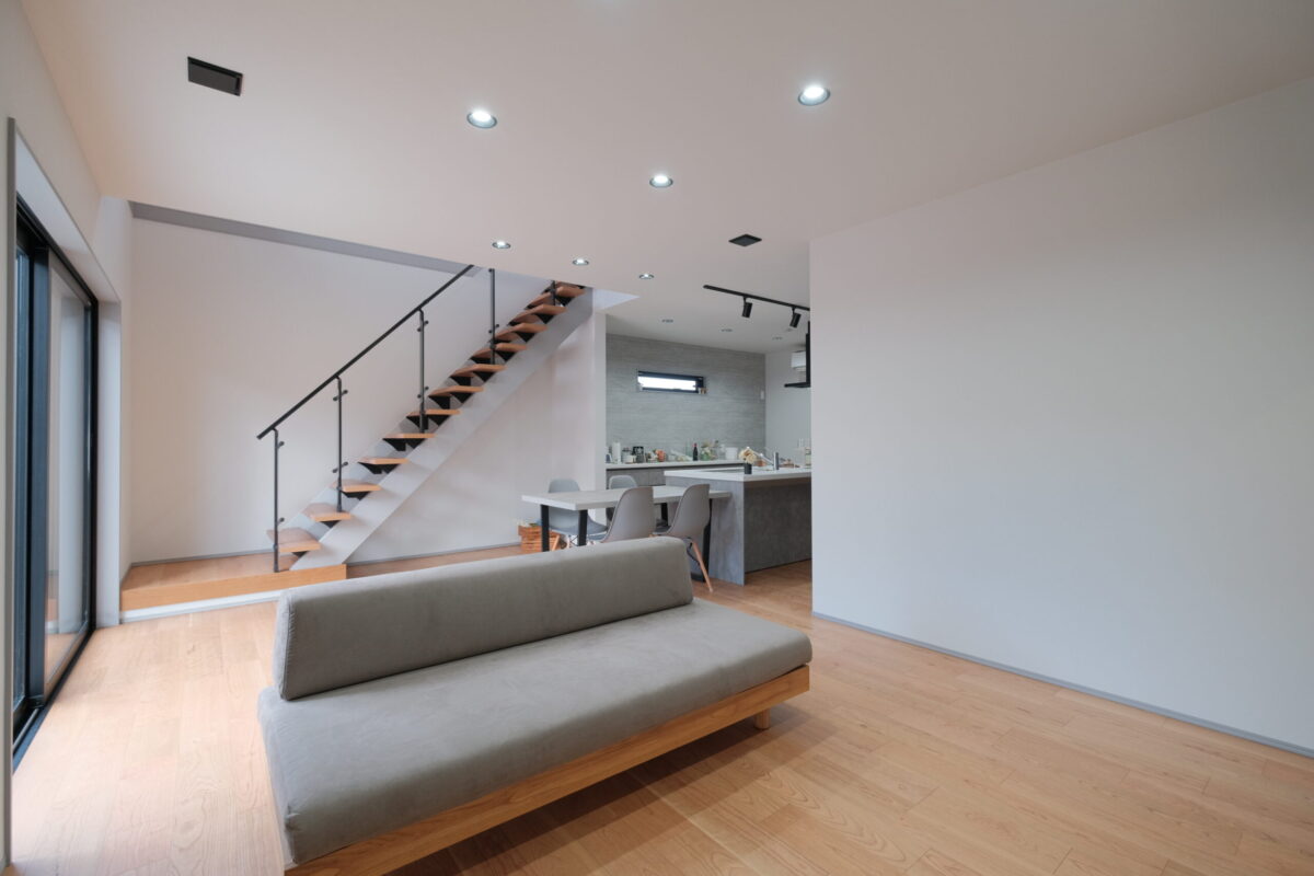 20帖の広々LDKでは家族でゆったりくつろげます。 さらに、階段の上部吹き抜けがより開放感を感じさせてくれます。